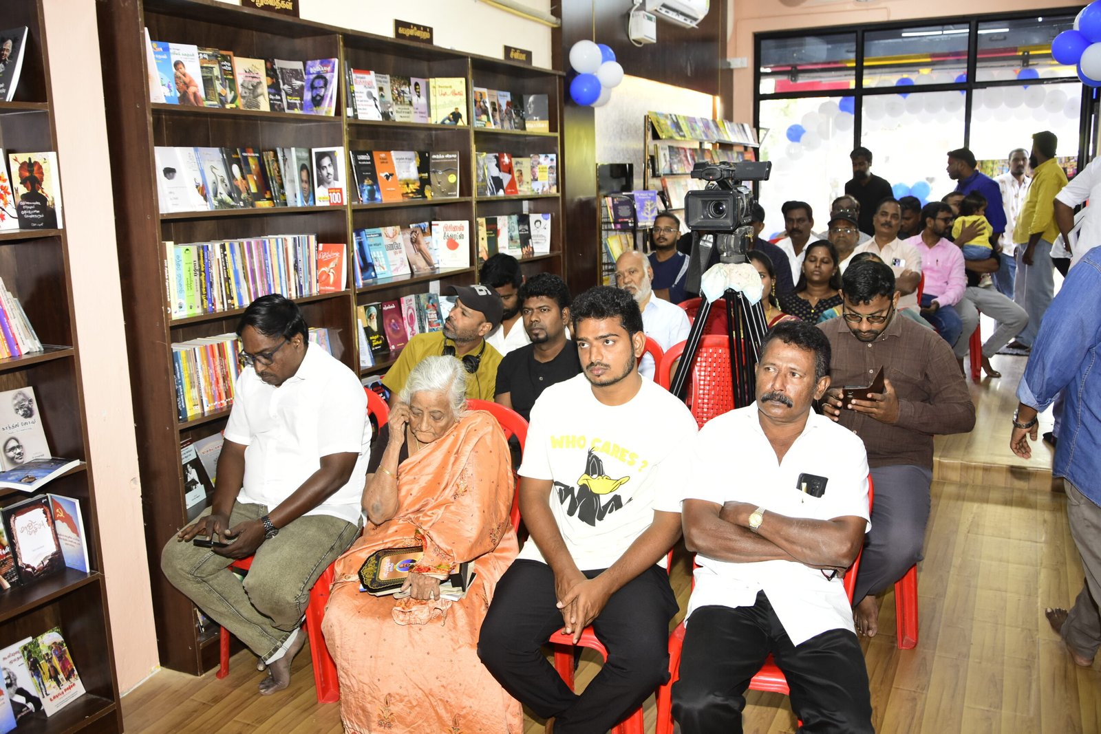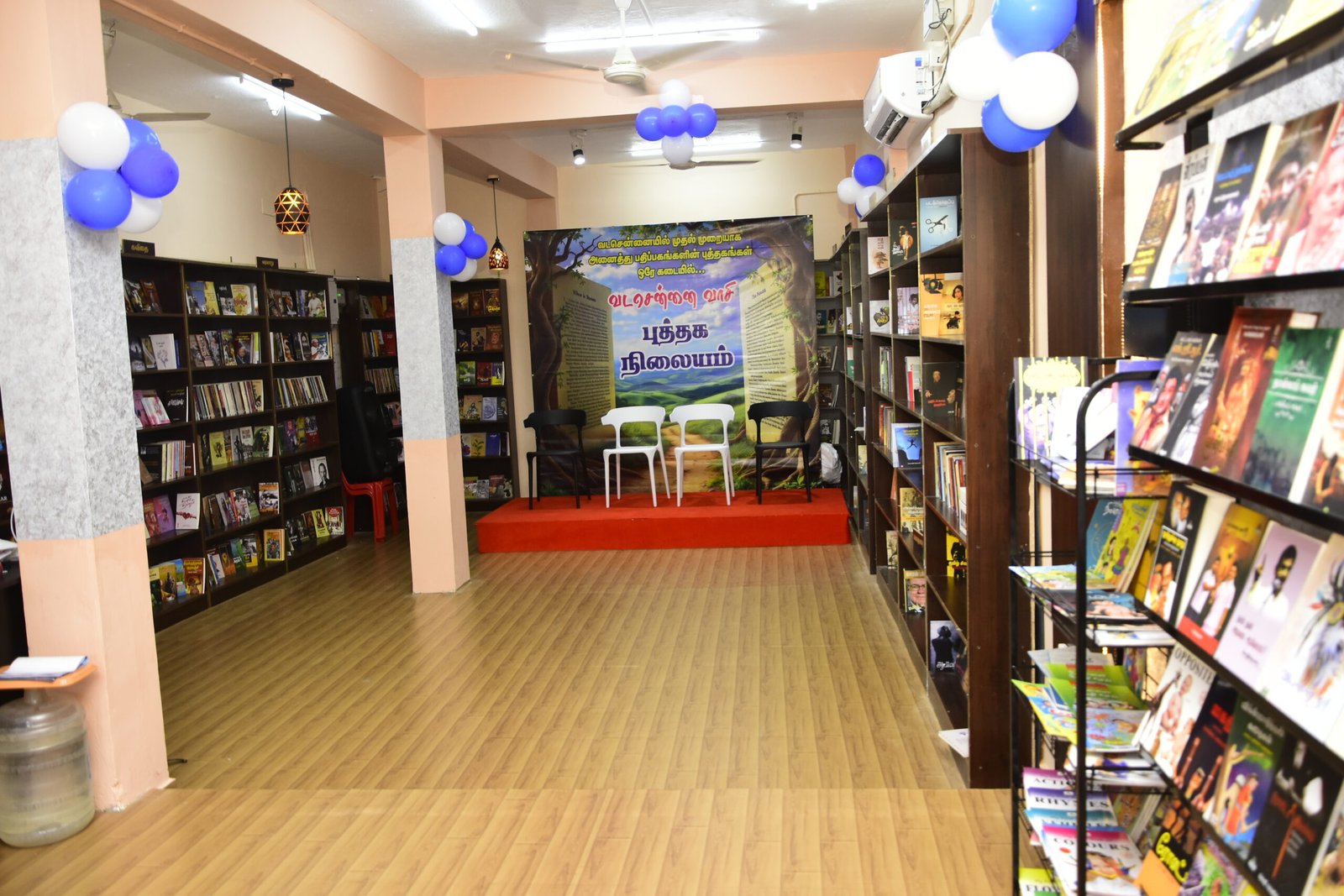 The hall is fully equipped with chairs, tables, a microphone system, AC, and is surrounded by books and inspiring Tamil literary quotes—creating a peaceful and motivating environment.